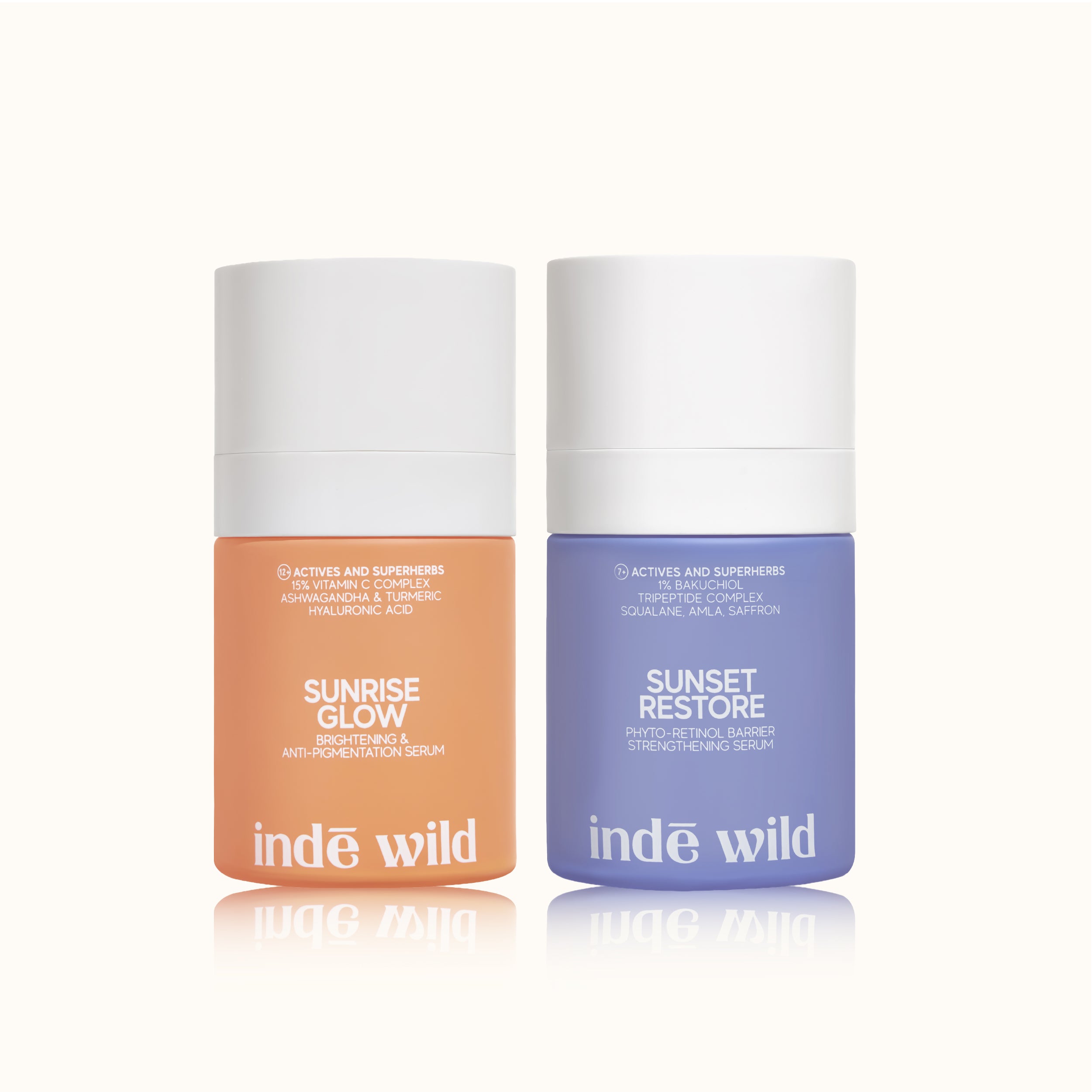 Why it works together: Our AM Serum protects your skin throughout the day from free radicals produced by external aggressors including pollution and UV light. This decadent hero is fortified with potent actives and the most powerful antioxidant L-Ascorbic acid along with Ferulic acid, Vitamin E, Niacinamide, Ashwagandha and Turmeric to brighten, fade hyperpigmentation and soothe skin. Containing 8 beneficial ingredients in one product, it keeps your skin protected, hydrated and ready for the day. The result? That indē wild glow.